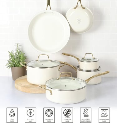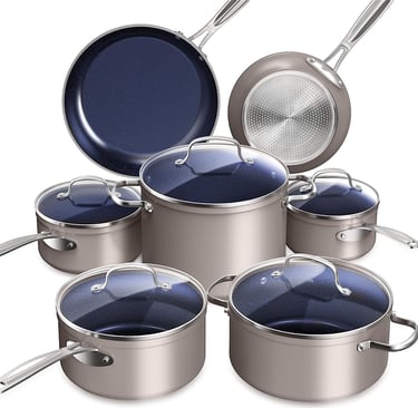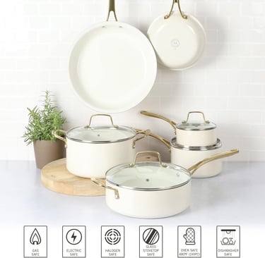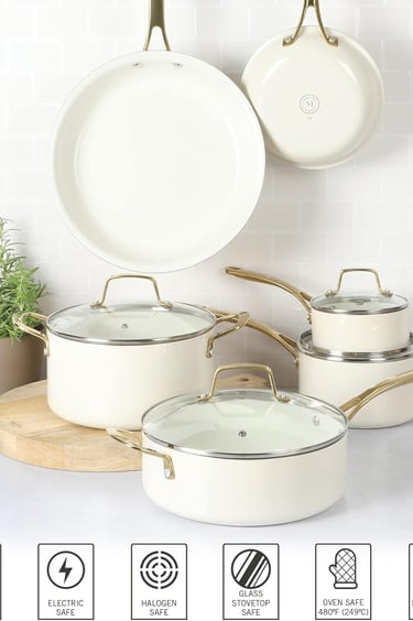 The Lowdown: Martha Stewart brings her signature style to the kitchen with this elegant linen white and gold set. It features a heavy-gauge aluminum body for even heating and a ceramic non-stick interior.