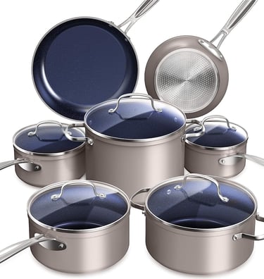 The Lowdown: Think of this as the slightly more stylish sibling of the 12pc set. It shares the same premium forged construction and G10 Duralon Blue coating but often comes in beautiful, sparkly colors.